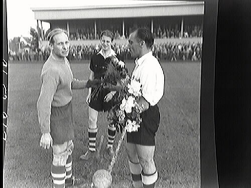 Fotboll. ÖSK - Drammen Norge. 3-1. Lagkapten Sten Dahl byter blommor med Drammens kapten.
