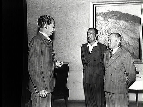 Sten Dahl och 'Klämmen' Pettersson får plakett av Närkes Fotbollsförbunds ordförande Alf Lindman vid Frimurarlogen.