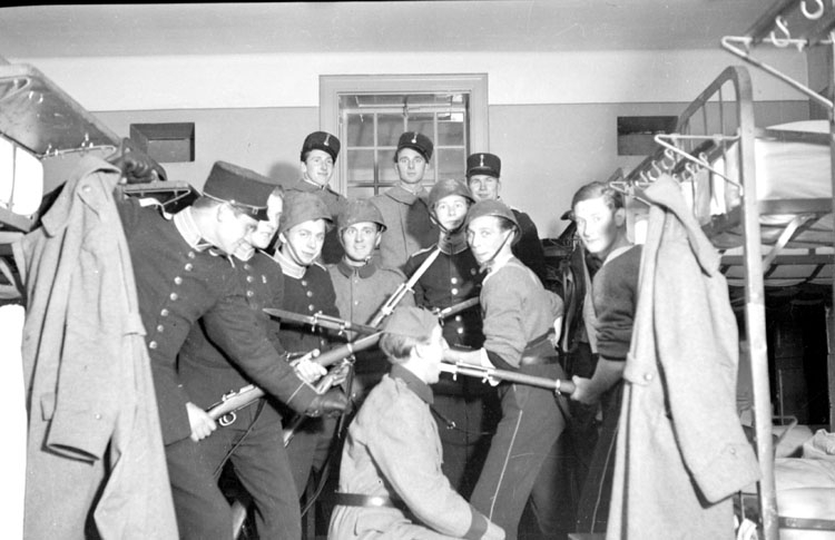 Militärerna med uniform och gevär på luckan (sovsalen) vid I3 Örebro.