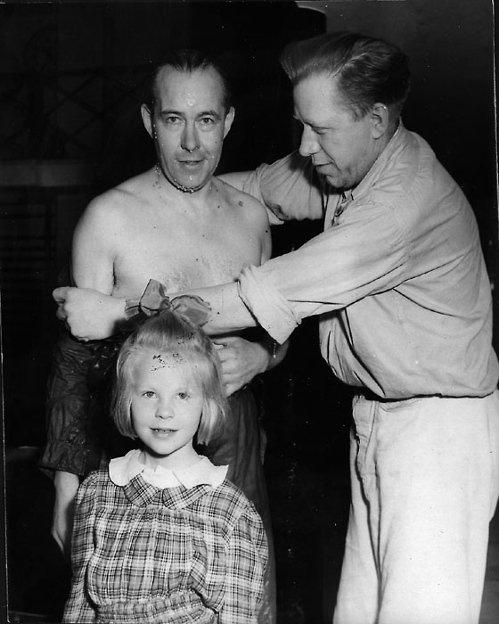 Badmästare Kalle Tiderman och E.Berglund med en liten flicka vid gamla Kallbadhuset "Kallis".