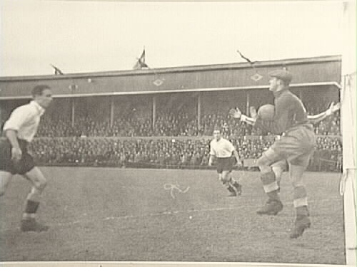 Målvakt Henry Andersson IFK Göteborg fångar bollen framför Gösta Lind, ÖSK.