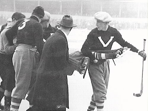Bandy vid Eyravallen. Viljans målvakt skadad, bärs ut från planen.