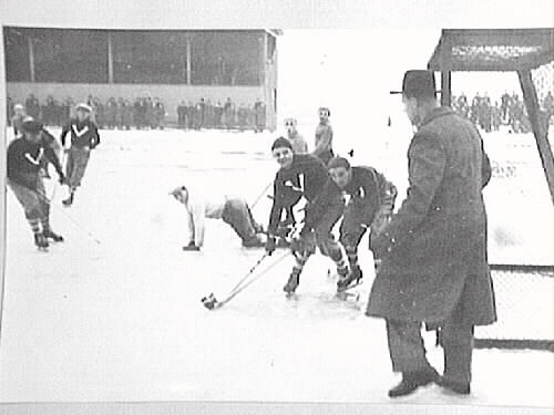 Bandymatch på Eyravallen. Måldomare Sten Jonsson synar noga målet.