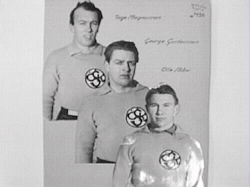 Tage Tjappe Magnusson, Georg Jojje Gustafsson och Olle Sääv i gula tröjor samt ÖSK märke som Rut Andersson på klubblokalen har virkat.
