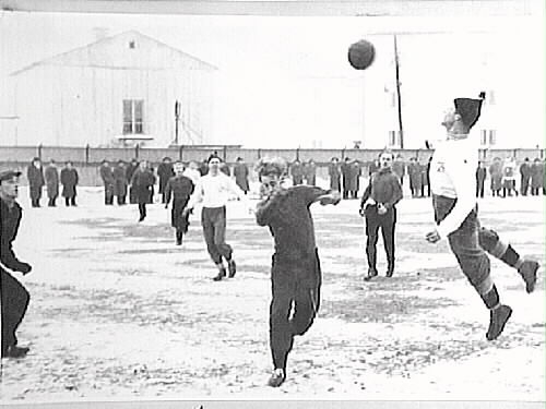 23/3 ÖSK-fotbollslaget som slog Gjöa (Oslo) 7-1. R.Larsson nickar mot Gjöa.