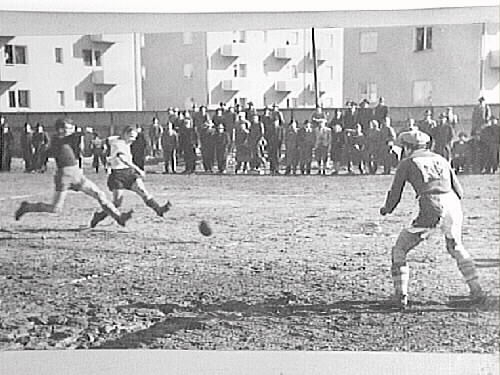 23/3 ÖSK-fotbollslaget som slog Gjöa (Oslo) 7-1. Åke Engvall i anfall mot målvakt.