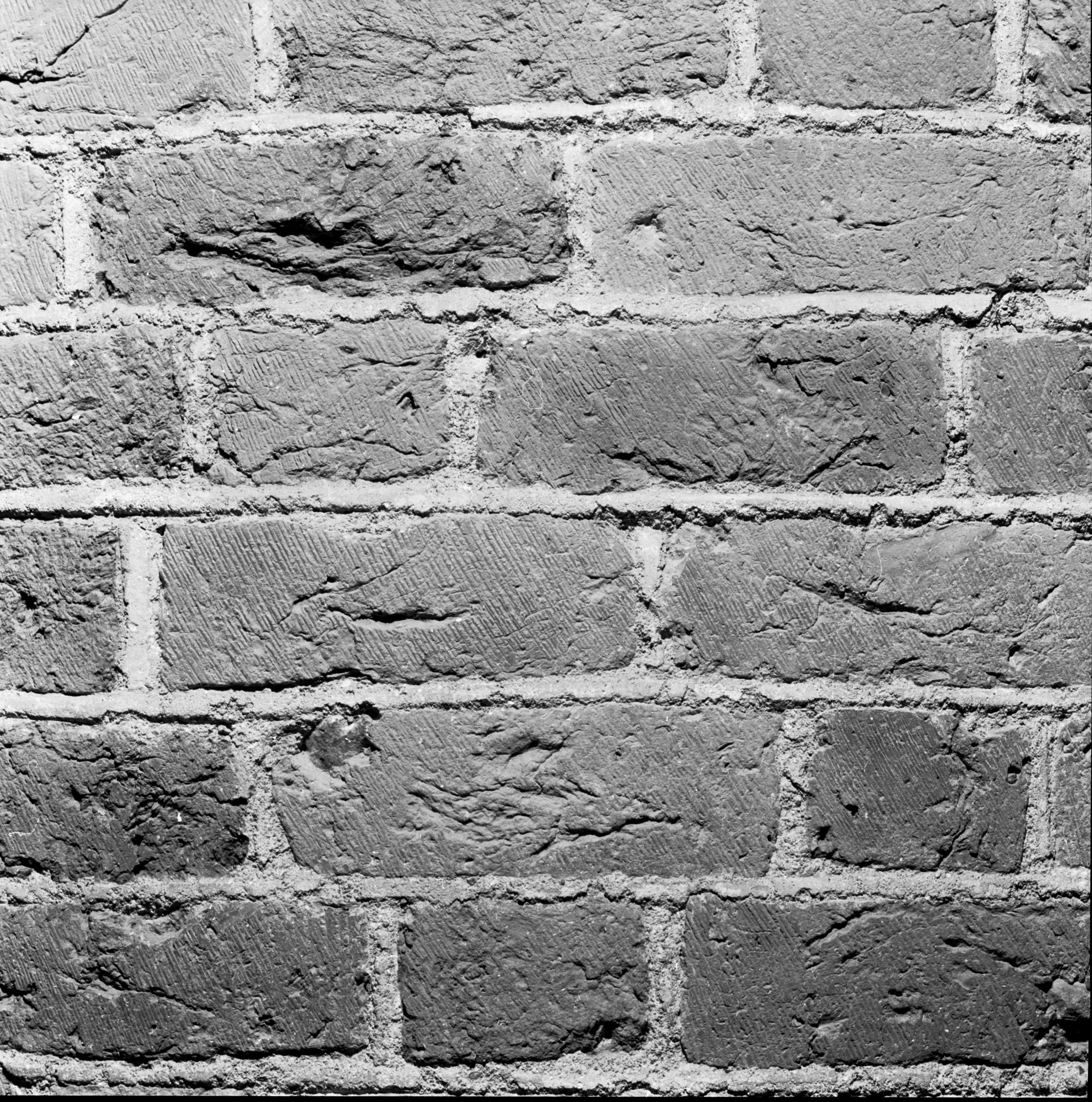 Pelare, del av grov rundpelares yta av bearbetat tegel.