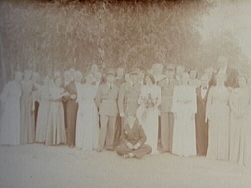 Bröllop, gruppbild 29 personer, brudpar och bröllopsgäster.