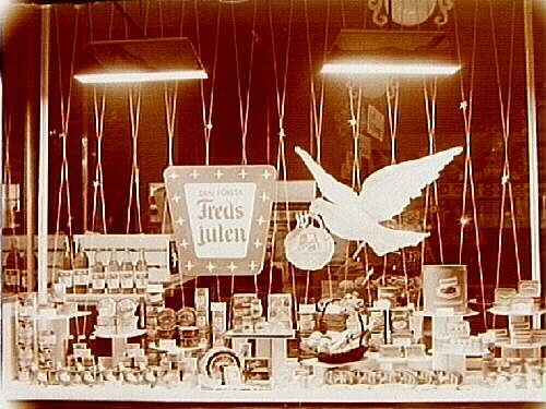Konsums skyltfönster, julskyltning för den första fredsjulen, delikatesser, konserver.