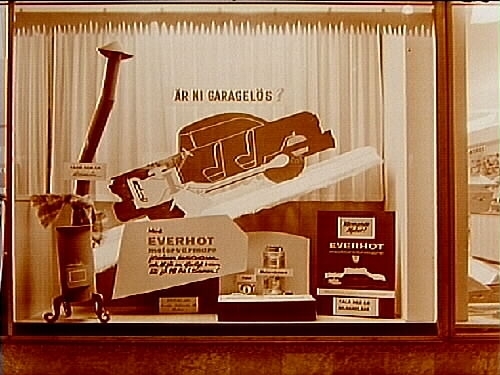 Svenska skiffer AB:s skyltfönster med varmvattenberedare och motorvärmare.
