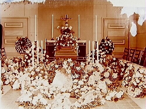 Kyrkointeriör, begravning, likkista och begravningskransar.