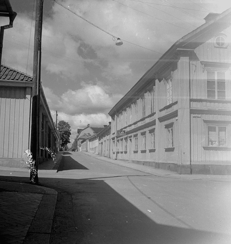 Bostadshus. Nora, kvarteret Pelikan 6. Svartälvsgatan med korsande Kunggatan.