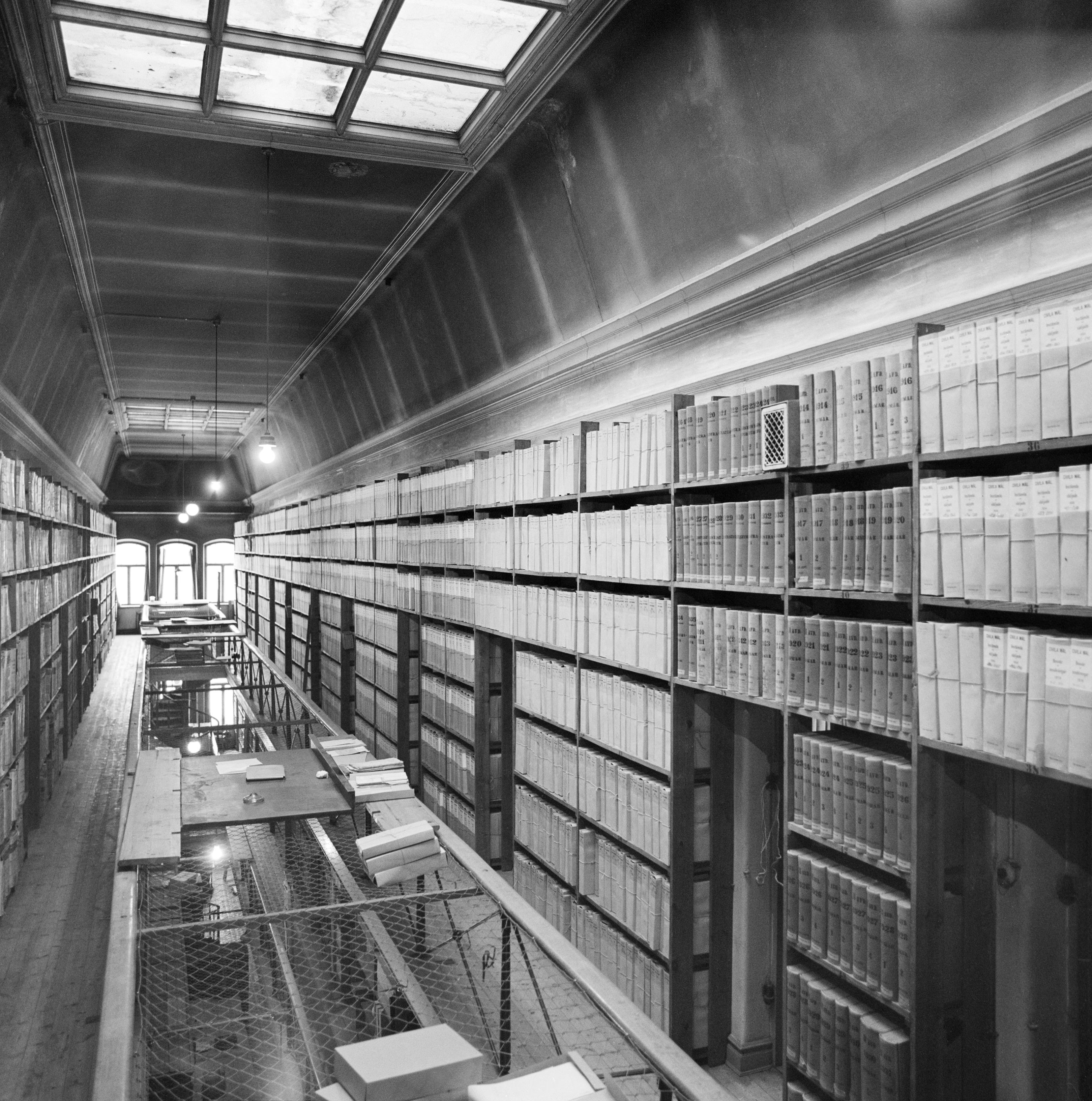 Ljusgården, centralrummet, med arkivalier på hyllor. Fängelset uppfördes 1895-1897 och verksamheten lades ner 1924. Från 1925 användes byggnaden som arkivdepå för Riksarkivet. Byggnaden revs 1968.