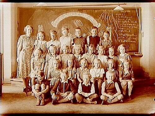 Engelbrektsskolan, klassrumsinteriör, 15 flickor, 10 pojkar med lärarinna fröken Astrid Vidén, sal 15.