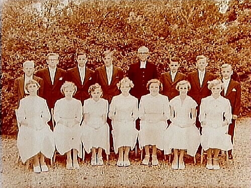 Konfirmander, sju flickor, sju pojkar och kyrkoherde Gunnar Johansson.