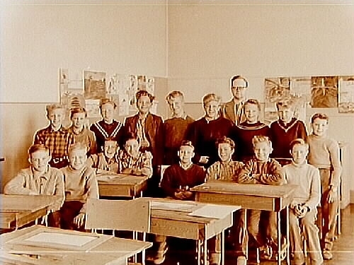 Olaus Petriskolan, klassrumsinteriör, 17 pojkar med lärare Viktor Pettersson, klass 6A, sal 20.