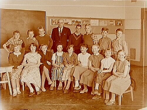 Olaus Petriskolan, klassrumsinteriör, 16 skolbarn med lärare Torsten Eriksson, klass 6Bb, sal 20.