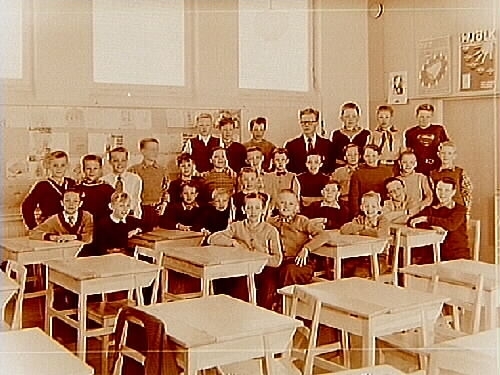 Rostaskolan, klassrumsinteriör, 29 pojkar och lärare Mårtensson, klass 4C, sal 15.
