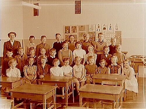 Olaus Petriskolan, klassrumsinteriör, 27 skolbarn med lärarinna fru Svea Lind, klass 2b, sal 18.