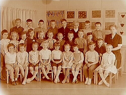 28 skolbarn och lärarinna fröken Dagmar Persson.