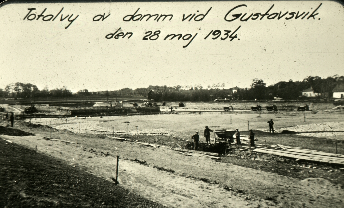 Totalvy av Gustavsvik med dammen, 1934-05-28.