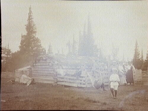 Samling utanför en liten stuga (koja)