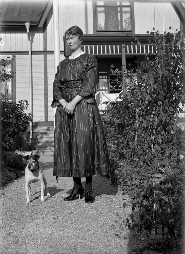 Bostadshus, en kvinna och en hund framför huset.