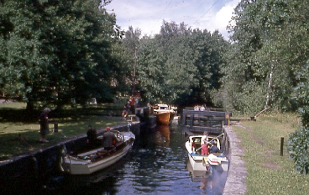Titel: 1193-1196 Slussen, foto åt norr. 1197 Slussen åt nordväst. 1198 Slussen, södra slussportarna o slussbron mot söder. 1968-07.