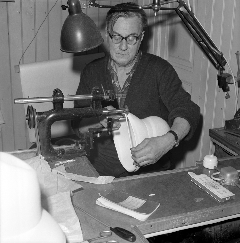 Hattillverkning. 195/67 Skärning av brätte. Efter formningen skäres hatten vid brättet.