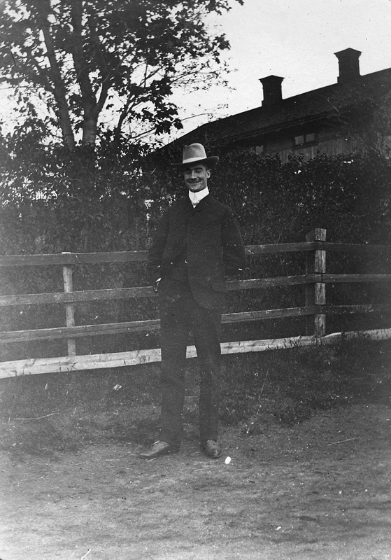 En man. Bostadshus i bakgrunden.