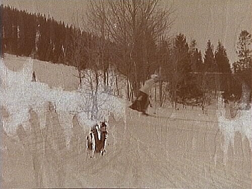 Kvinna på skidor. (Otydlig bild)