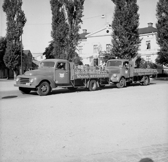 Wasa bryggeriet, två lastbilar med dryckbackar. Byggnader i bakgrunden.