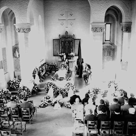 Vivi Karlbergs begravning, kyrkointeriör, begravningskista och begravningskransar.