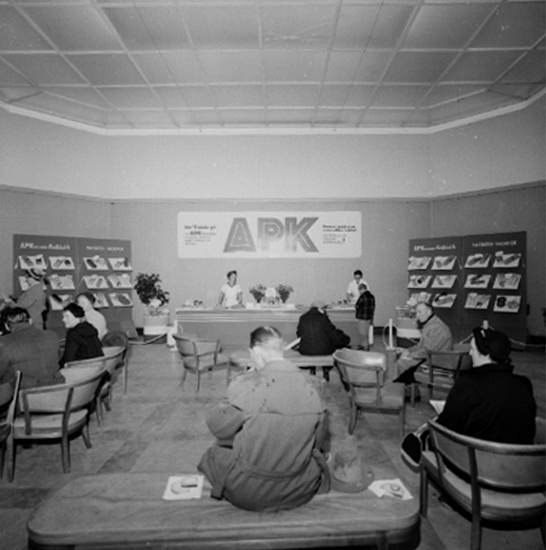 Titel: Utställning på Konsthallen, interiör, APK:s utställningsmonter (Kjellgrens Brödfabrik AB). "Kula" Karlsson
