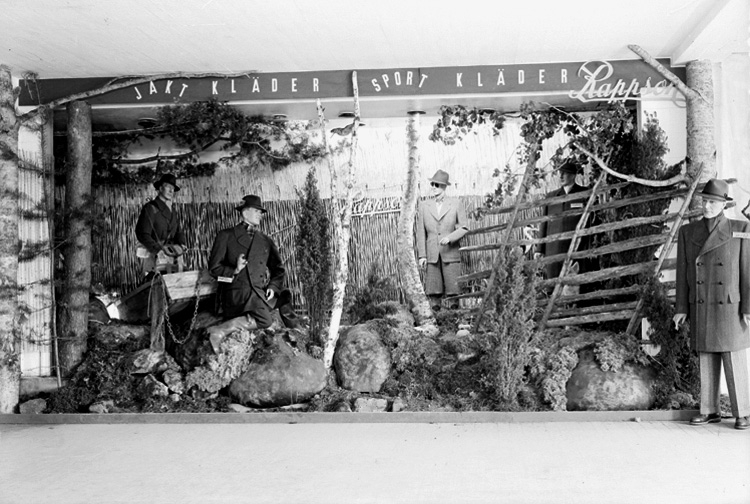 Jakt- och Naturvårdsutställningen, interiör, Rappsons monter med jakt- och sportkläder.