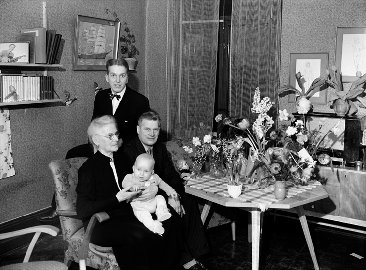 Rumsinteriör, familjegrupp 4 personer, högtid.