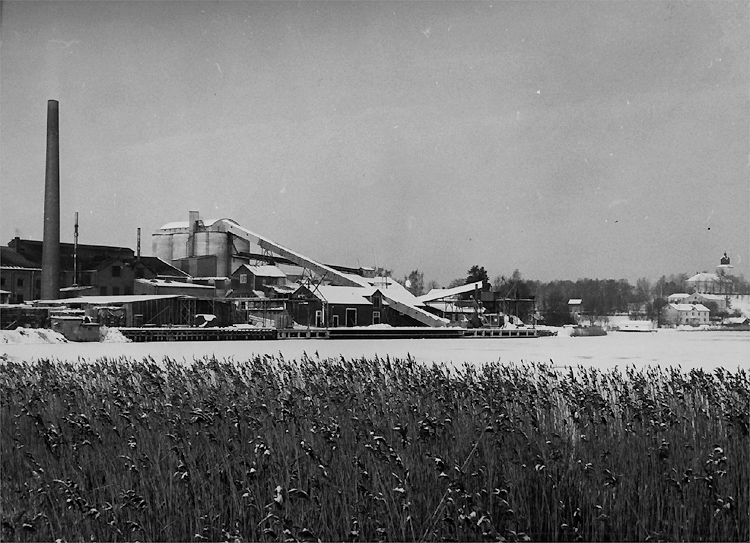 Bostadshus och kyrkobyggnad till höger på bilden.