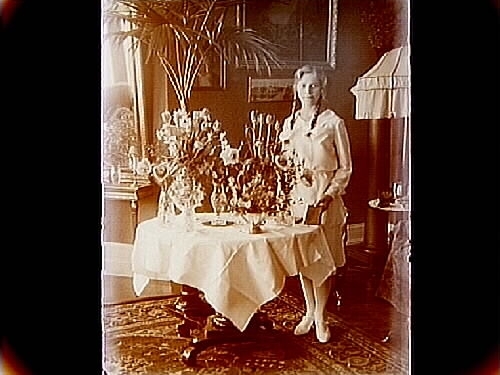 Rumsinteriör, en kvinna vid blomsterbordet.