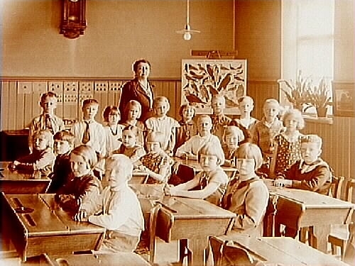 Rudbecksskolan, klassrumsinteriör, 21 skolbarn med lärarinna fröken Frida Tollstorp.