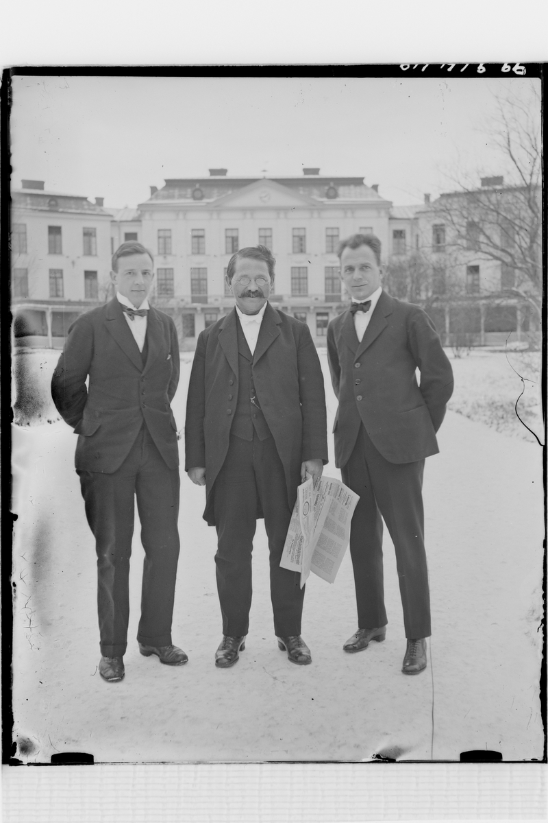 Hålahults sanatorium, exteriör, tre män utanför huvudbyggnaden, snö på marken, till vänster V.H Steffen underläkare 1/1 1920 - 15/8 1922