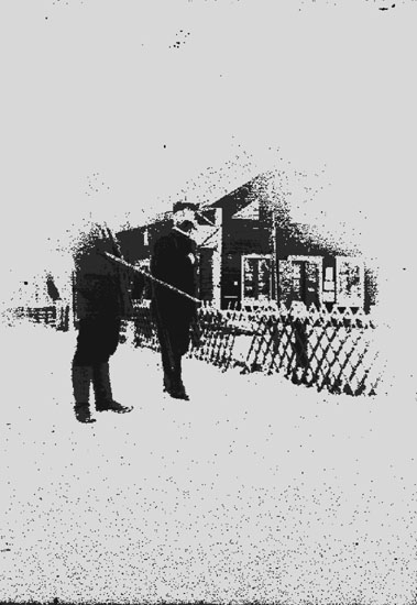 Bostadshus, två jägare med jaktvapen framför huset.