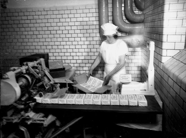 Smörpackning, smörpackningsmaskin, en kvinna.