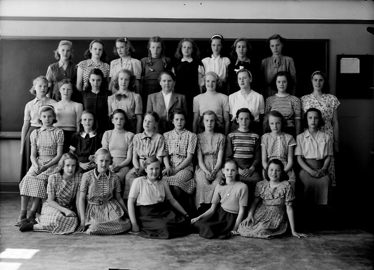 Kommunala Flickskolan, klassrumsinteriör, 30 flickor med lärarinna fru Greta Zommarin.