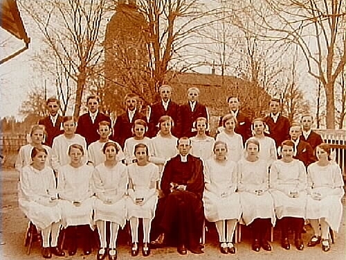 Konfirmander, 16 flickor, 9 pojkar och pastorn.
