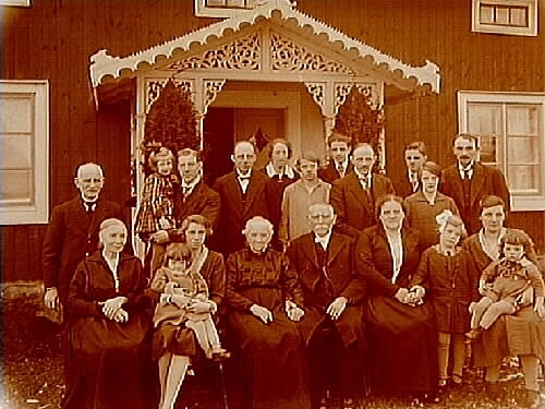 Guldbröllop, släktgrupp 20 personer framför huset.