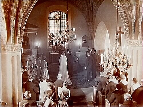 Vigsel i kyrkan, brudpar och bröllopsgäster.