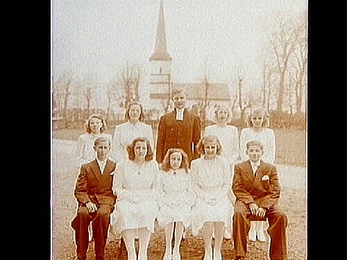9 konfirmander: 7 flickor, 2 pojkar och kyrkoadjunkt Hagberg.