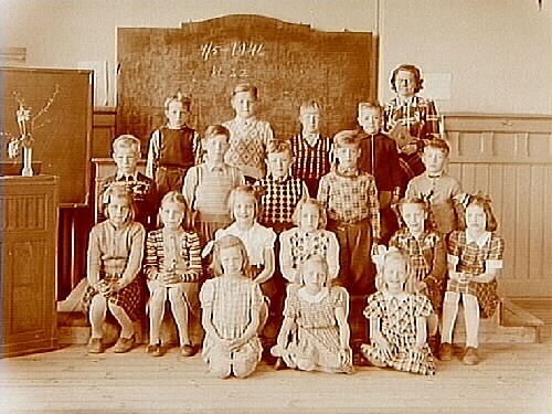 Almby Södra skola, klassrumsinteriör, 9 flickor, 9 pojkar med lärarinna fröken Karin Olsson, sal 3, klass 2.