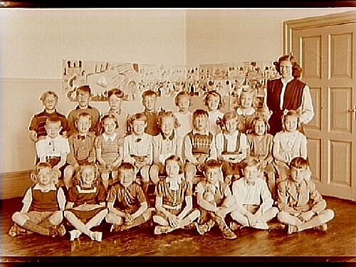Vasaskolan, klassrumsinteriör, 23 skolbarn med lärarinna fröken Wanja Bromander, klass 1p, sal 8.
