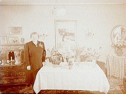 Titel: Fru Anna Larssons 50 årsdag. Rumsinteriör, en kvinna.
